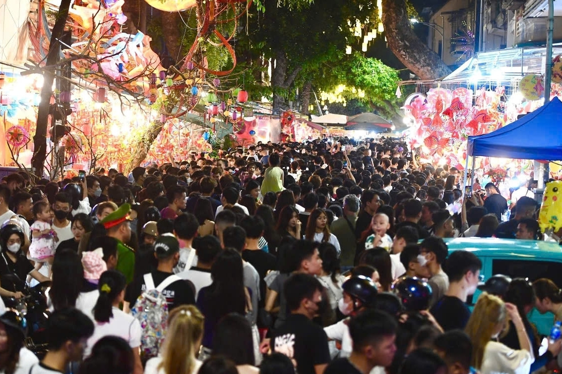 Phố Hàng Mã và các tuyến phố bán đồ chơi ở quận Hoàn Kiếm (Hà Nội) đông nghẹt người khi các gia đình, giới trẻ và cặp đôi đổ về, hòa vào không khí đêm Trung thu.