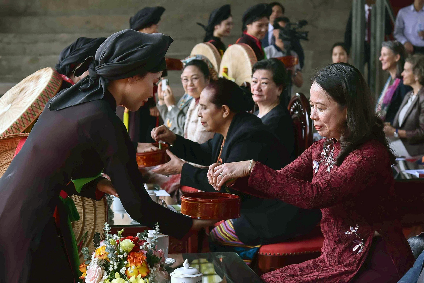 Trong không gian cổ kính của vùng Kinh Bắc, Phó Chủ tịch nước Võ Thị Ánh Xuân và các nữ Đại sứ, Trưởng đại diện tổ chức quốc tế cùng trải nghiệm làm tranh Đông Hồ, thưởng thức các làn điệu Quan họ.