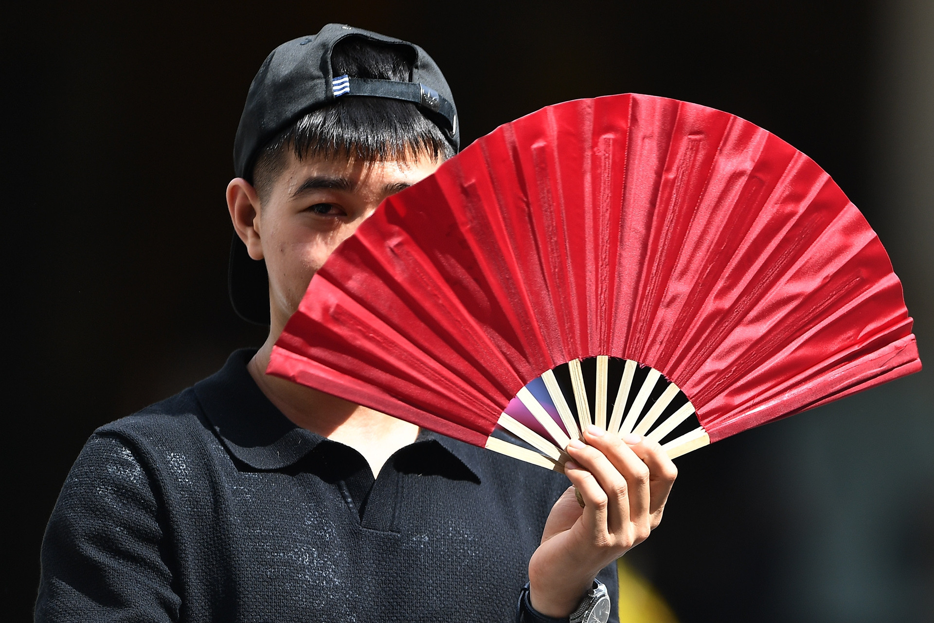 Che ô, mang các loại quạt lẫn nước uống là vẫn chưa đủ để người dân và du khách thoát khỏi sự khó chịu với nắng nóng hơn 40 độ C giữa trưa chủ nhật (3/8).