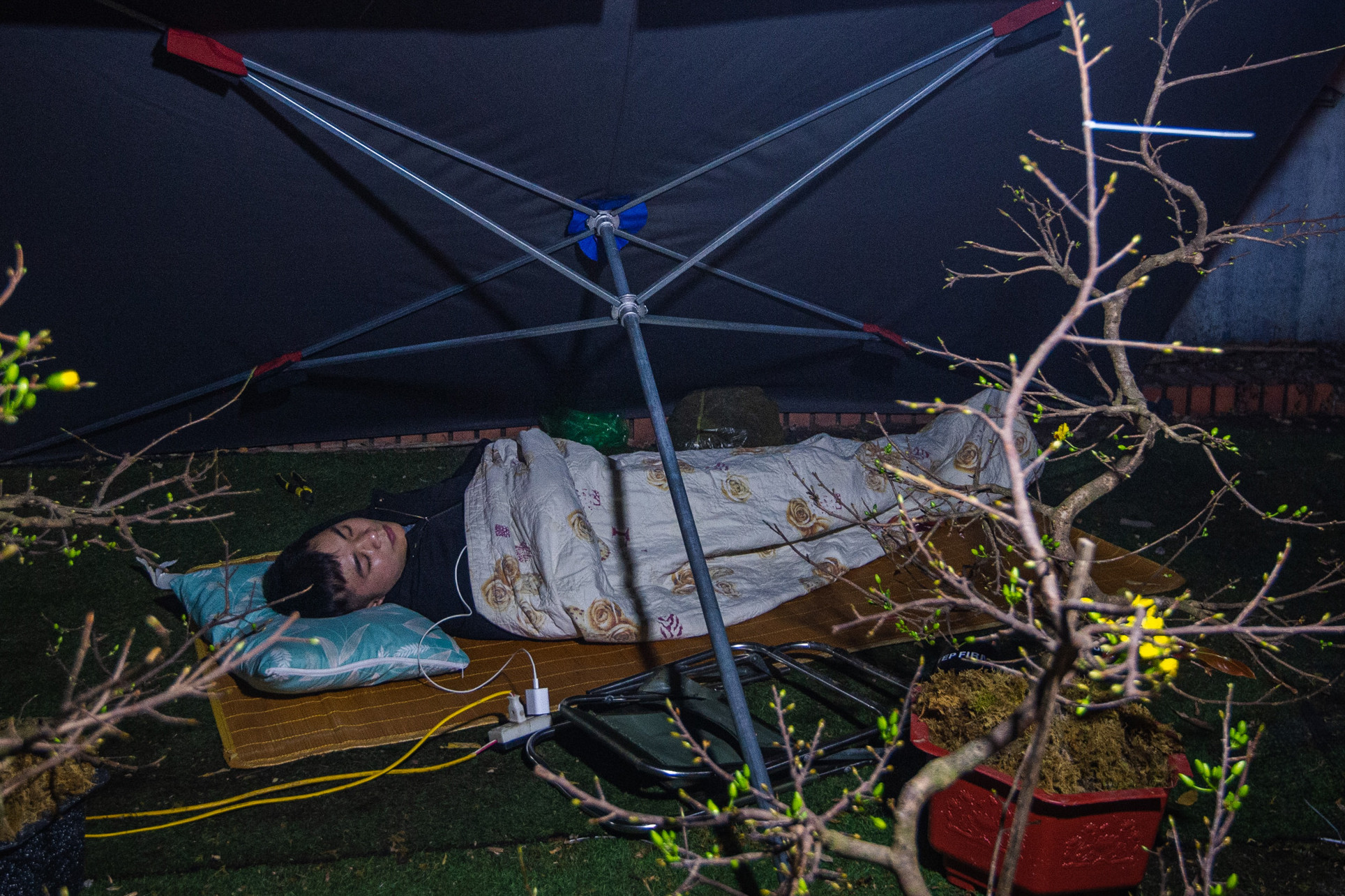Những tiểu thương, người làm thuê cho các sạp buôn bán cây cảnh trên vỉa hè chợ hoa Lạc Long Quân (Hà Nội) vừa ngủ qua đêm vừa lo ngại vấn đề kẻ trộm lẻn vào đánh cắp hàng.
