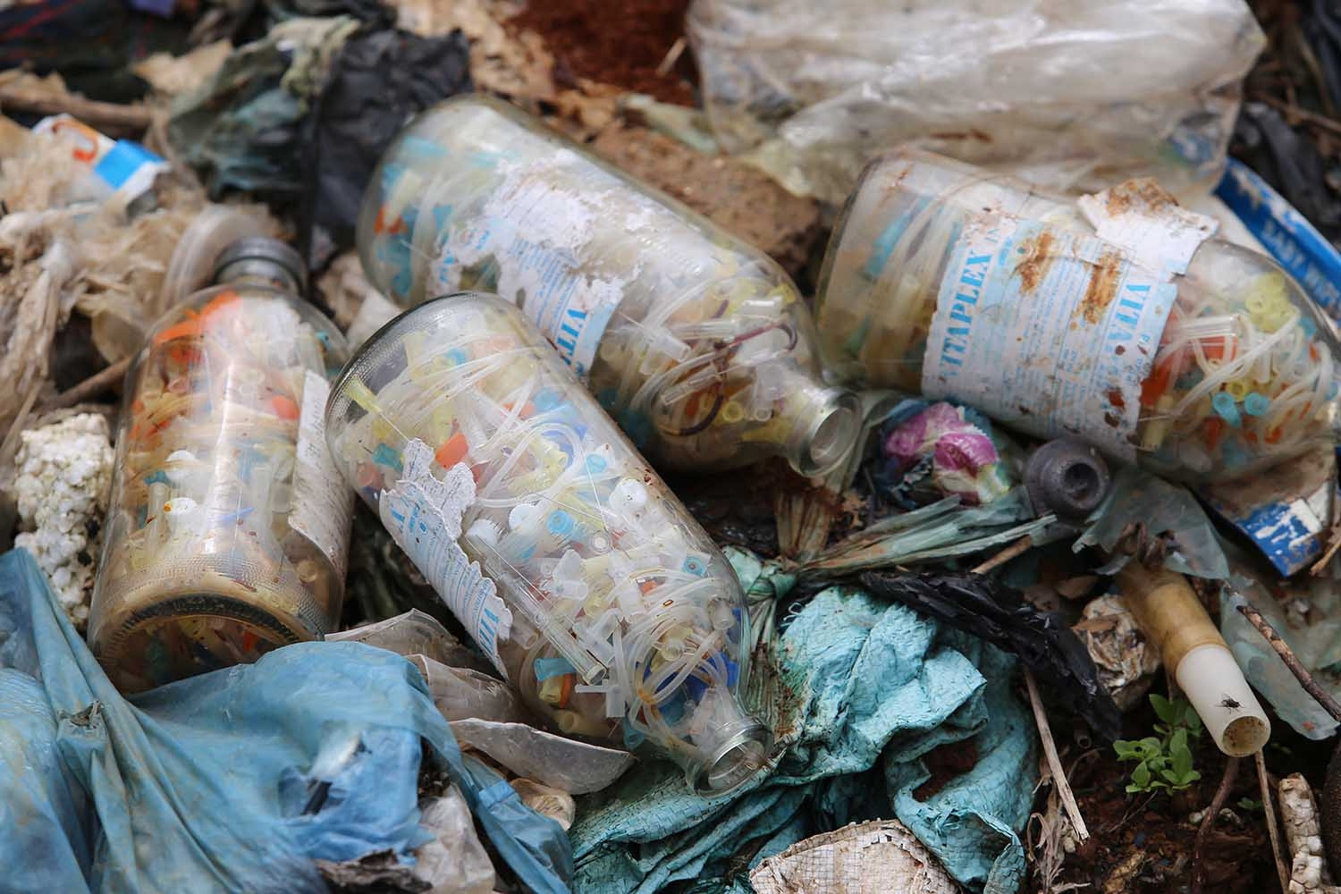 Rác thải y tế như kim tiêm, ống truyền dịch còn đọng máu được vứt bỏ tại bãi rác sinh hoạt cách UBND huyện Mộc Châu (tỉnh Sơn La) khoảng 500m.