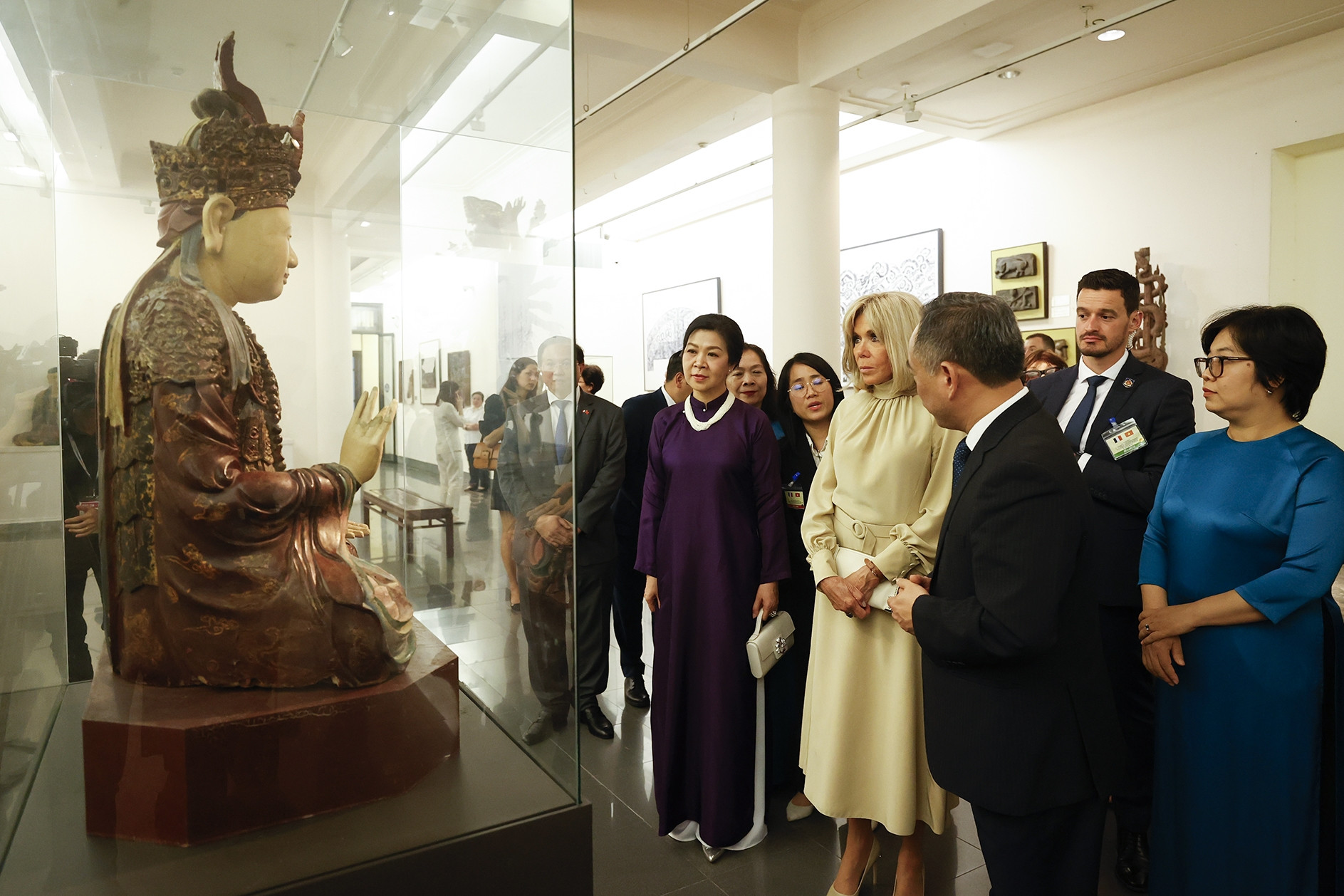 Tại Bảo tàng Mỹ thuật Việt Nam, chiều nay, bà Ngô Phương Ly, Phu nhân Tổng Bí thư Tô Lâm đã tiếp bà Brigitte Macron, Phu nhân Tổng thống Pháp Emmanuel Macron.