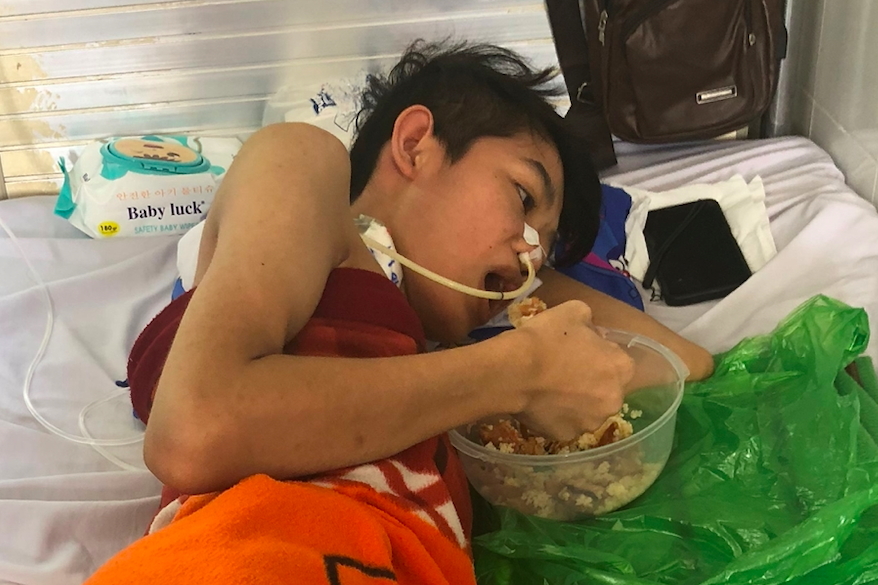 “Anh cố gắng mau khỏe còn về với em, với con". Nghe tiếng vợ thủ thỉ, anh Thái gật đầu. Từ hốc mắt anh, hai hàng lệ chảy xuống trong bất lực.