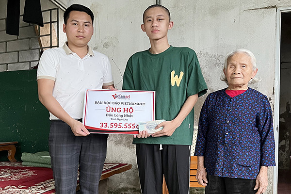 Đại diện Báo VietNamNet vừa trao số tiền 33.595.555 đồng đến em Đậu Long Nhật mắc căn bệnh u màng não, sống cùng bà ngoại đã ngoài 80 tuổi.