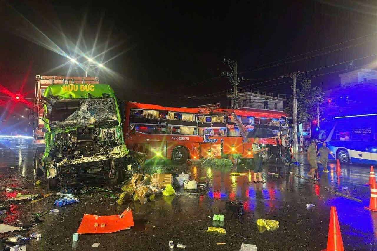 Hàng chục người la hét sau va chạm giữa ô tô khách và xe container