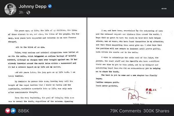 Trước đó, ngôi sao Cướp biển vùng Caribbean sử dụng các tài khoản chính thức trên Instagram và Facebook để chia sẻ tâm thư sau khi giành chiến thắng trong cuộc chiến pháp lý với Amber Heard. Tài khoản Instagram của Johnny Depp hiện có 24,5 triệu người theo dõi và 13 triệu người theo dõi trên Facebook.