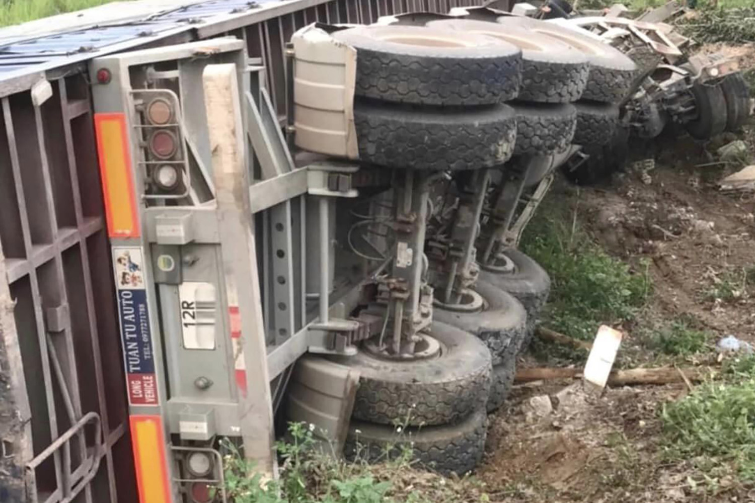 Tại hiện trường, xe đầu kéo bị lật xuống vệ đường, ô tô tải gãy bánh xe, nhiều mảnh vỡ vương khắp mặt đường.