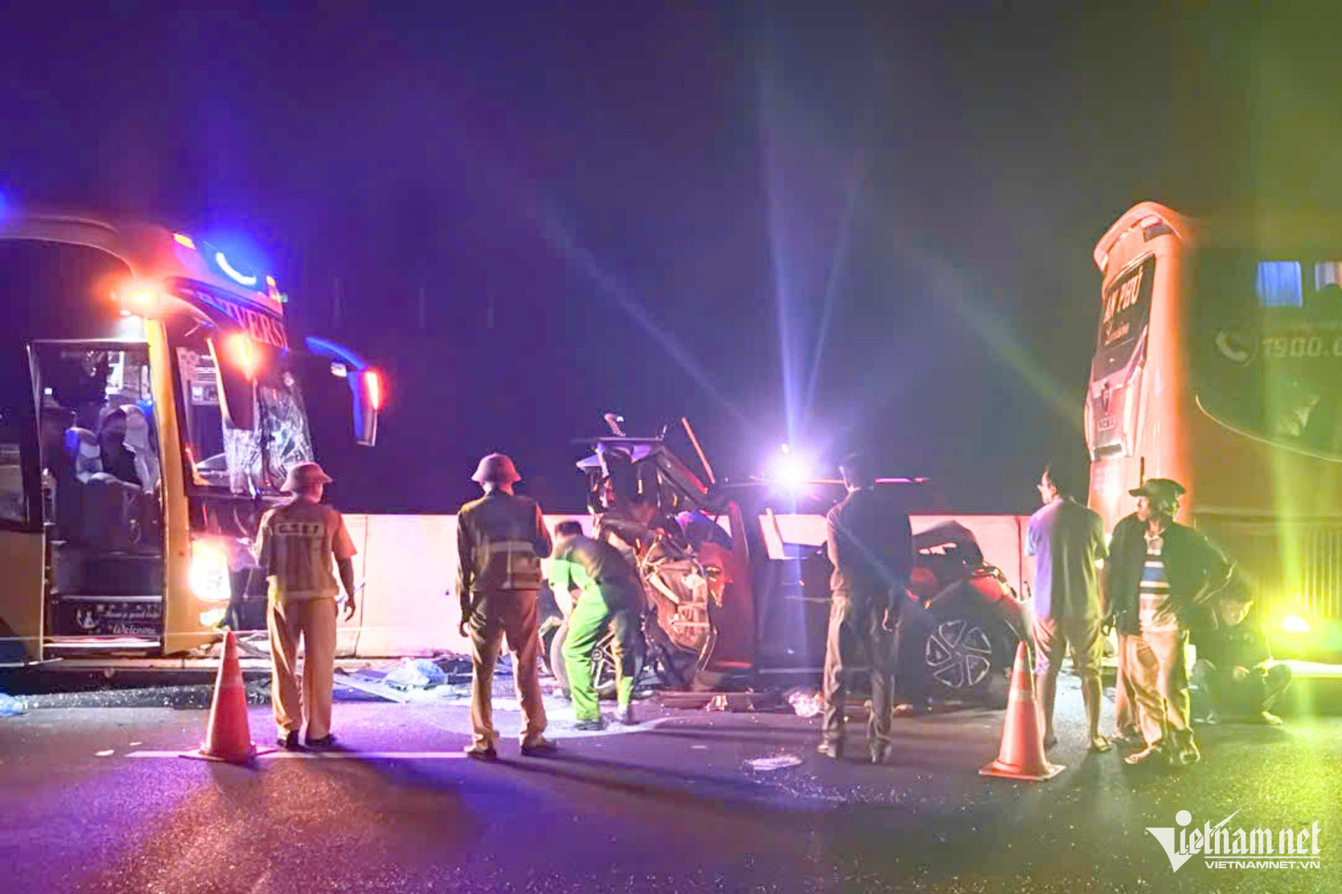 Tại hiện trường, 2 xe giường nằm hư hỏng đầu và đuôi, riêng ô tô con biển số TPHCM kẹp giữa bép dúm, biến dạng hoàn toàn. Nhiều hành khách trên xe giường nằm hoảng loạn sau vụ va chạm.