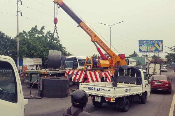 Đến 11h, lực lượng chức năng quận 7 điều xe cẩu đến di dời cuộn thép và xe gặp nạn đi.