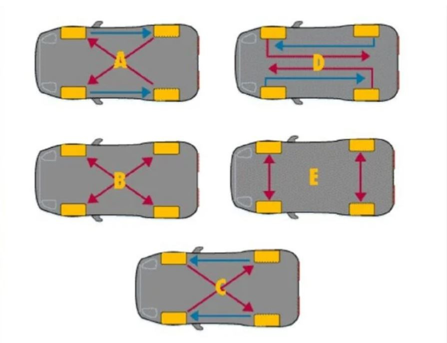 Hai bánh trước chuyển thẳng xuống bánh sau. Hai bánh sau đổi chéo lên trước.