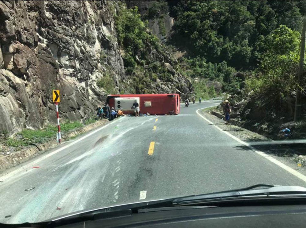 Chiếc xe 30 chỗ bị lật rồi trượt trên đường một đoạn dài. Sau đó phần đầu mới đụng vào núi, bẹp dúm. Các mảnh kính cùng đồ đạc của nạn nhân vương vãi tại hiện trường.