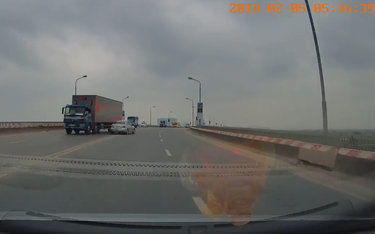 Chiếc xe tải chuyển làn không có đèn tín hiệu, ép xe cùng chiều sau đó lao vào dải phân cách vì tài xế ngủ gục. Sự việc xảy ra hôm 26/2 tại Philippines, rất may không ai bị thương.