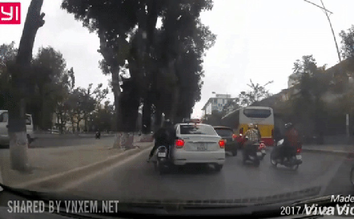 Thấy tên cướp đi xe máy giật túi xách của một người phụ nữ, tài xế taxi đã nhanh tay bẻ lái tông thẳng vào người tên cướp.