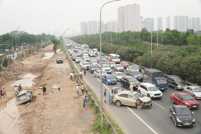 Tại hiện trường, xe Toyota Fortuner bị biến dạng, nằm ở khu vực bãi đất bên ngoài ranh giới đường, túi khí bị bung nổ. Xe Lexus nát đầu, nổ lốp, nằm giữa làn khẩn cấp và làn 3 của đại lộ Thăng Long.