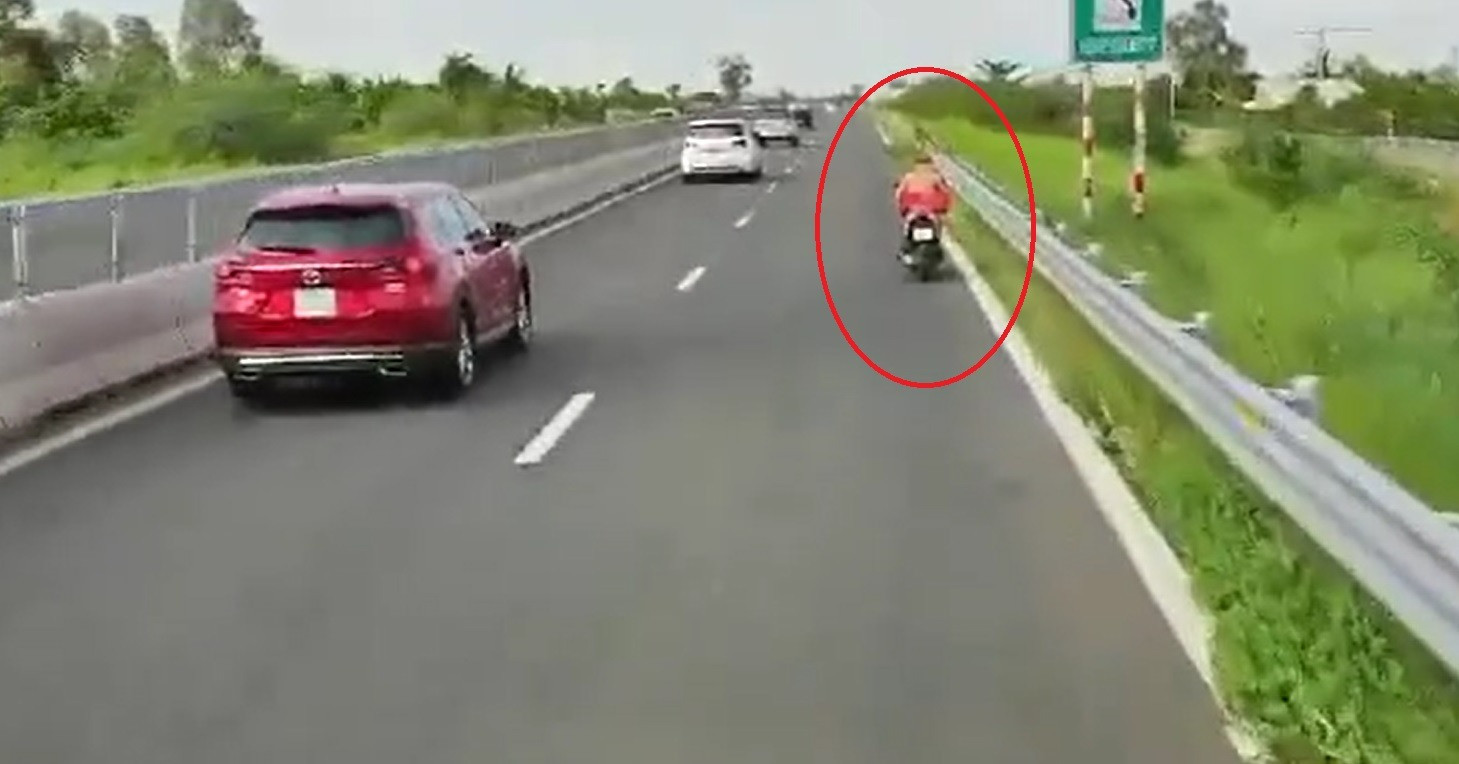 Đoạn video ghi lại hình ảnh một người phụ nữ điều khiển xe máy đi nhầm vào đường cao tốc Trung Lương - Mỹ Thuận (Tiền Giang).