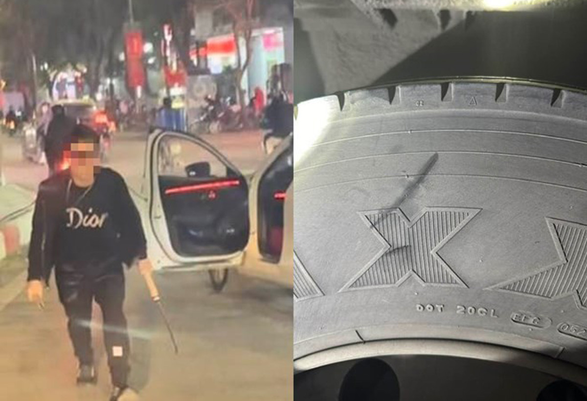 Trước đó, trên mạng xã hội xuất hiện một đoạn clip ghi lại hình ảnh người điều khiển xe ô tô Mazda biển kiểm soát 30G-429xx, cho dừng xe giữa đường Hoàng Quốc Việt, cầm dao chém nhiều nhát vào kính và phần lốp xe buýt.