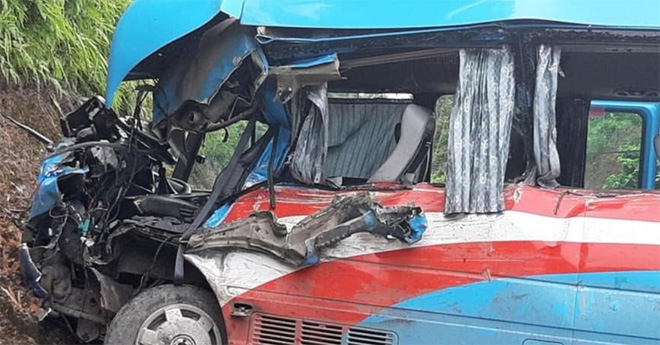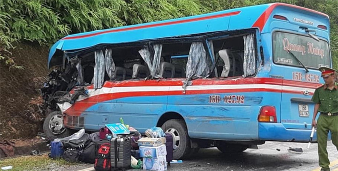 Đúng lúc này, xe khách biển kiểm soát 15B-027.92 đang chở 21 người là cán bộ, giáo viên ở TP Hải Phòng đi thiện nguyện tại các huyện Đồng Văn, Mèo Vạc, tỉnh Hà Giang đi tới, do tránh xe ô tô đầu kéo nói trên nên khiến xe mất lái, đâm vào vách núi.