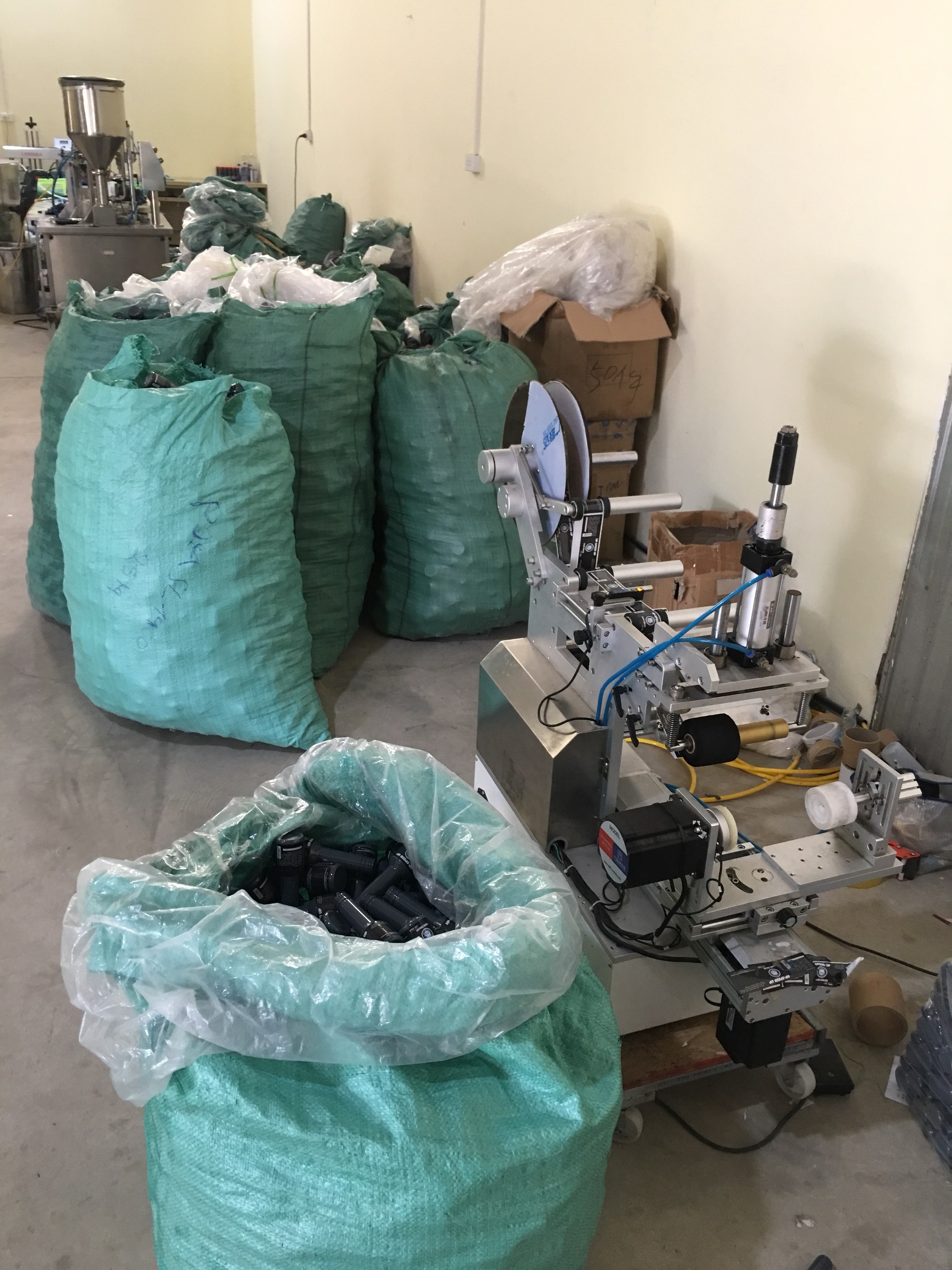 Nguyên vật liệu cùng với máy móc đóng gói sản phẩm bày la liệt trên sàn nhà trong nhà kho
