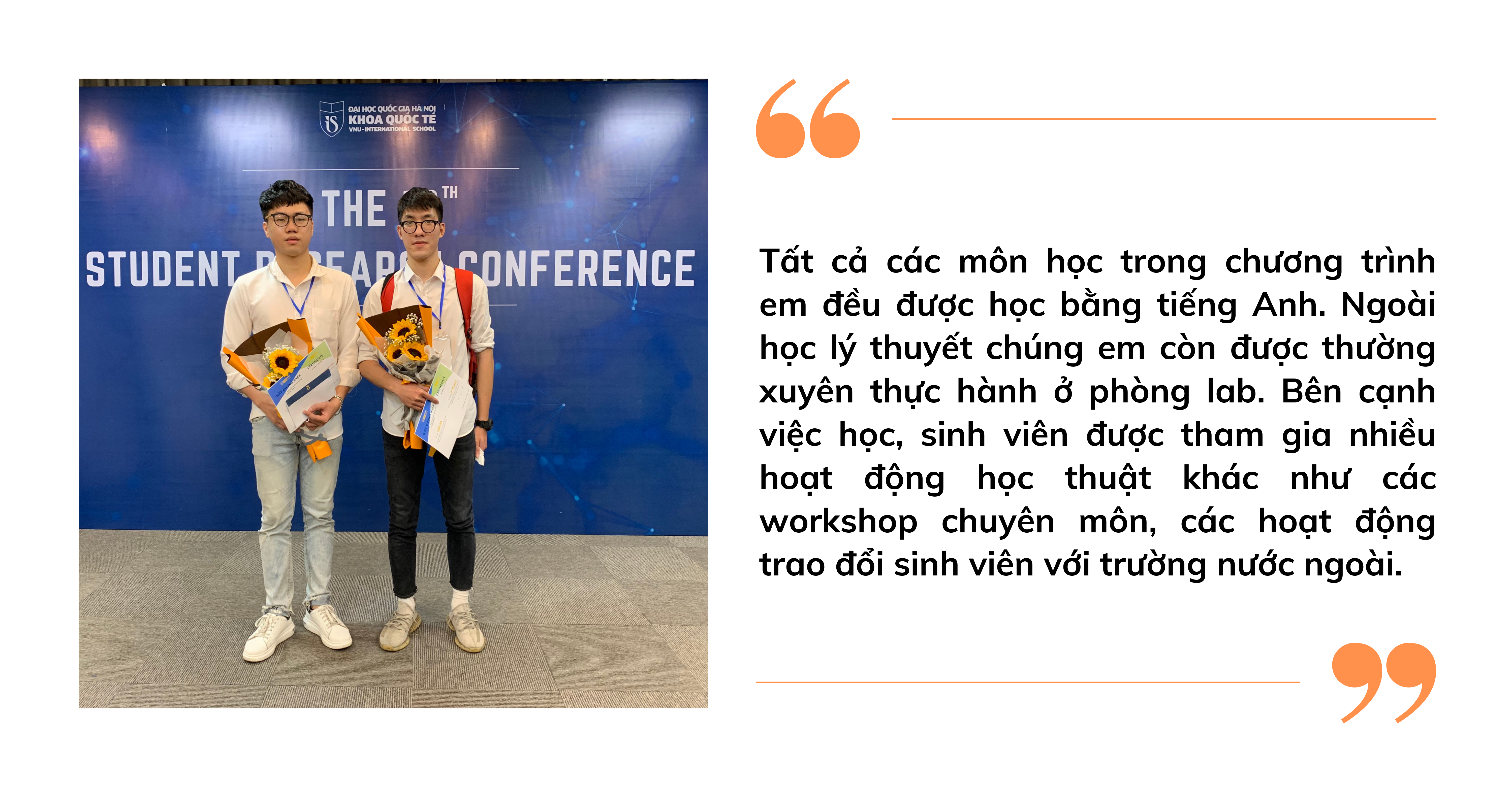 Nguyễn Ngọc Huy cho biết thêm: “Tất cả các môn học trong chương trình em đều được học bằng tiếng Anh. Ngoài học lý thuyết, chúng em còn được thường xuyên thực hành ở phòng lab. Sinh viên cũng được tham gia nhiều hoạt động học thuật khác như các workshop chuyên môn, các hoạt động trao đổi sinh viên với trường nước ngoài. Tất cả các hoạt động đó giúp nâng cao năng lực ngoại ngữ, năng lực chuyên môn và cả kỹ năng mềm cho sinh viên - điều mà các nhà tuyển dụng đánh giá rất cao”.
