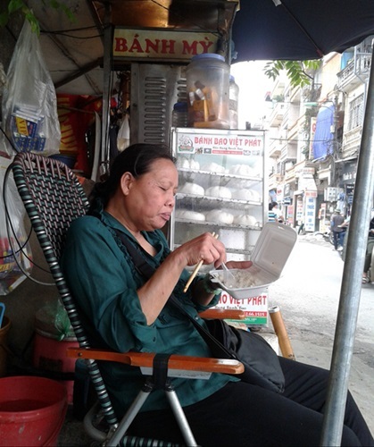 Theo ghi nhận của PV Báo Gia đình & Xã hội chiều 9/4 tại ngã 4 cầu Cống Mọc – Quan Nhân, người phụ nữ xuất hiện trong clip năm nay đã 62 tuổi, bán hàng nước và bánh mì. Khoảng 4 giờ chiều, bà vẫn đang loay hoay ăn dở hộp cơm.