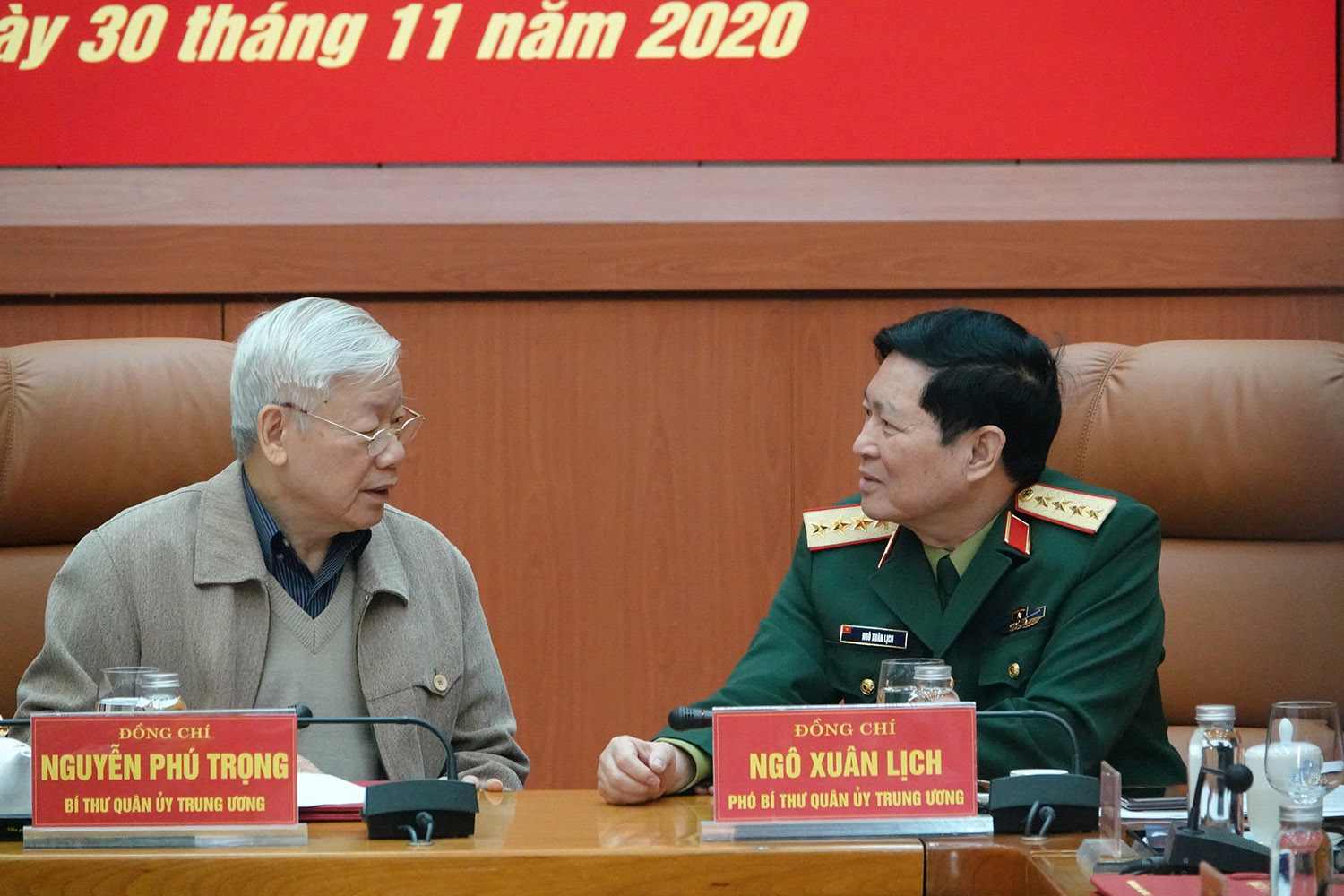 | Tổng Bí thư, Chủ tịch nước Nguyễn Phú Trọng và Bộ trưởng Quốc phòng Ngô Xuân Lịch tại hội nghị. |