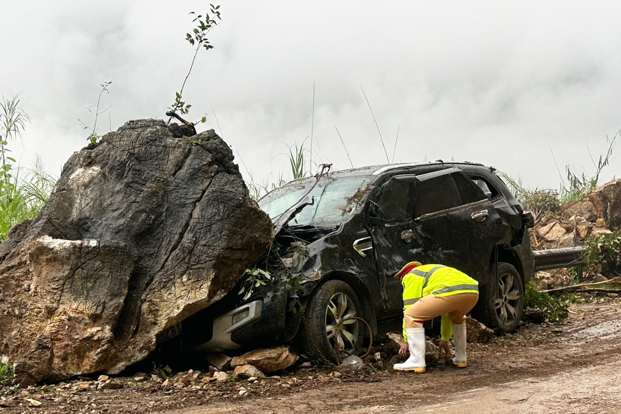 Theo đó, vào sáng cùng ngày, ô tô mang BKS 052.XX do ông L.H.H. (trú tại TP Sơn La, tỉnh Sơn La) điều khiển trên Quốc lộ 6. Đến Km128+750 (địa phận xã Tòng Đậu, huyện Mai Châu) thì gặp sạt lở, tảng đá lớn nặng hàng tấn từ trên cao lăn xuống rơi trúng xe.