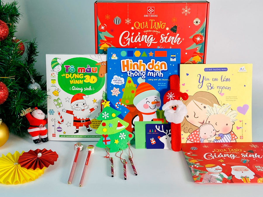 Nhân dịp Giáng sinh sắp tới, Đinh Tị Books sáng tạo hộp quà đặc biệt tích hợp cả 2 yếu tố, giúp trẻ phát huy khả năng học hỏi qua những cuốn sách đồng thời cũng có những giờ phút vui chơi thỏa thích cùng người thân. Hộp quà gồm bộ 3 cuốn sách hấp dẫn, ngập tràn sắc màu Giáng sinh, cùng set quà tặng Giáng sinh xinh xắn.