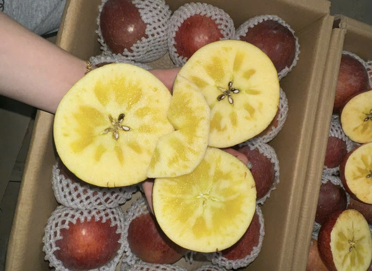 Khi quả già chín, vỏ sẽ chuyển sang đỏ đậm. Bổ ra phần ruột táo bên trong hơi ngả sang màu vàng nhạt, xen lẫn phần trong suốt (gọi là những tia mật táo). Táo có tỷ lệ mật càng nhiều thì càng giòn ngon, ngọt đậm. Bởi vậy, một số đầu mối còn quảng cáo đây là “phiên bản táo mật Nhật Bản” xuất xứ Trung Quốc.