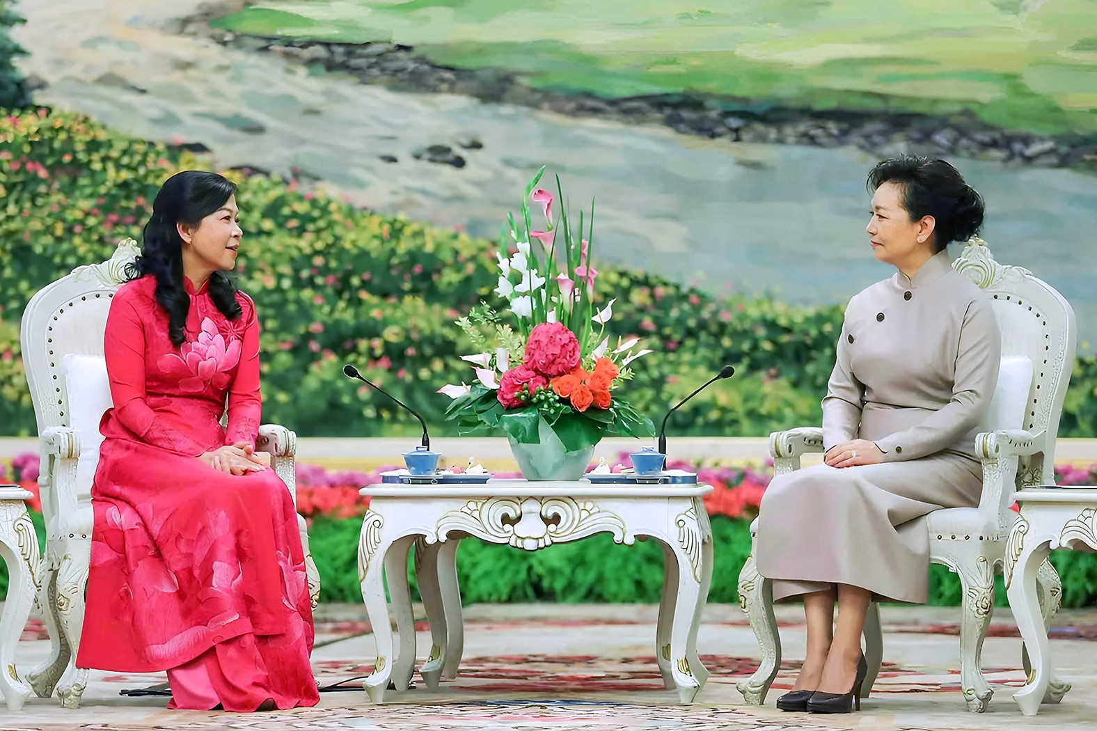 Phu nhân Tổng Bí thư, Chủ tịch nước Tô Lâm, bà Ngô Phương Ly đã cùng Phu nhân Tổng Bí thư, Chủ tịch nước Trung Quốc Tập Cận Bình, Giáo sư Bành Lệ Viên thưởng trà, xem biểu diễn nghệ thuật.