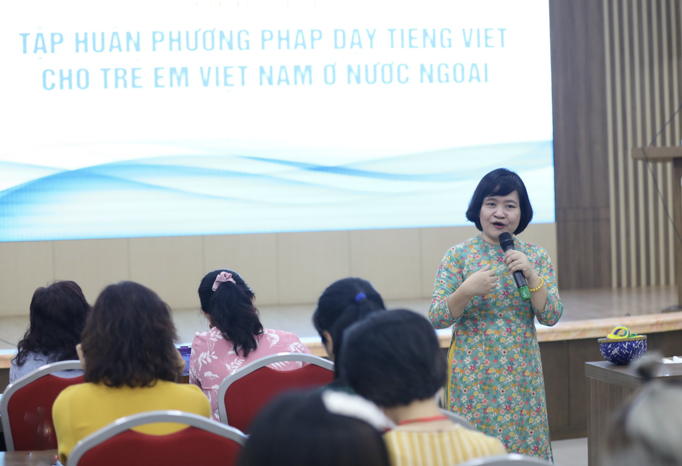 Tại buổi tập huấn, TS Nguyễn Thụy Anh, tác giả bộ sách giáo khoa "Chào tiếng Việt", trực tiếp trao đổi, hướng dẫn và dạy mẫu.