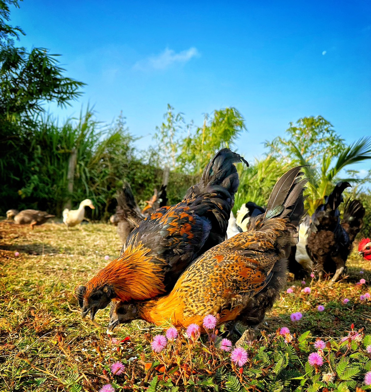 “Vườn khá rộng nên mình dành một nửa diện tích để trồng cây ăn quả dài ngày như vải, dứa. Một nửa còn lại, mình trồng các giống cây ngắn ngày như ngô và nuôi thêm gà, vịt, ngỗng, chim bồ câu,…”, nữ gia chủ cho biết.
