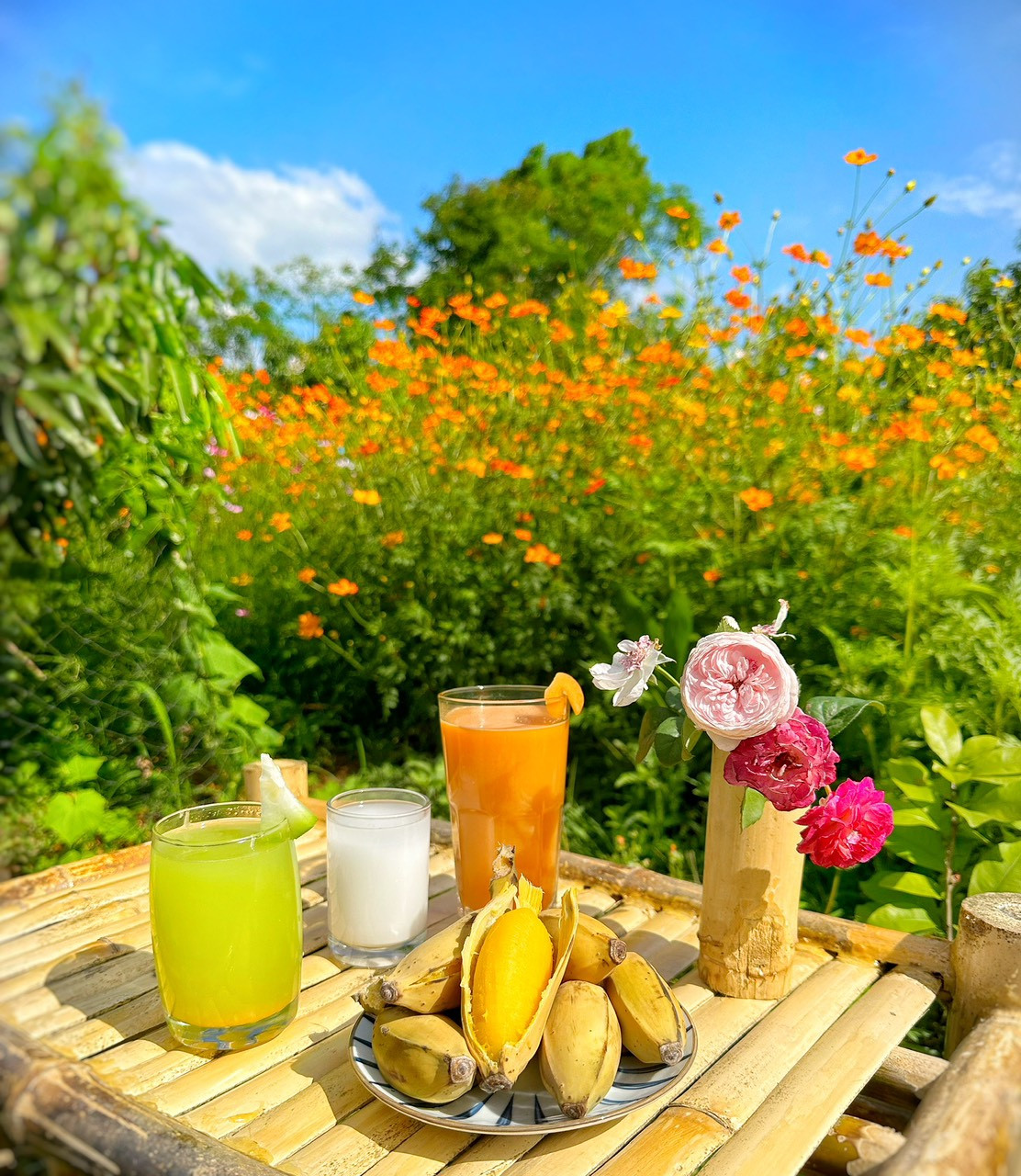 Để không gian sống đẹp mắt hơn, xung quanh vườn, chị trồng thêm nhiều loại hoa đủ màu sắc như sao nhái, hoa hồng, hướng dương, ti-gôn,… Nữ gia chủ còn tận dụng các khúc gỗ, củi khô để dựng cổng, làm bàn trà ngoài trời,… tạo những góc check-in thú vị ngay tại gia.