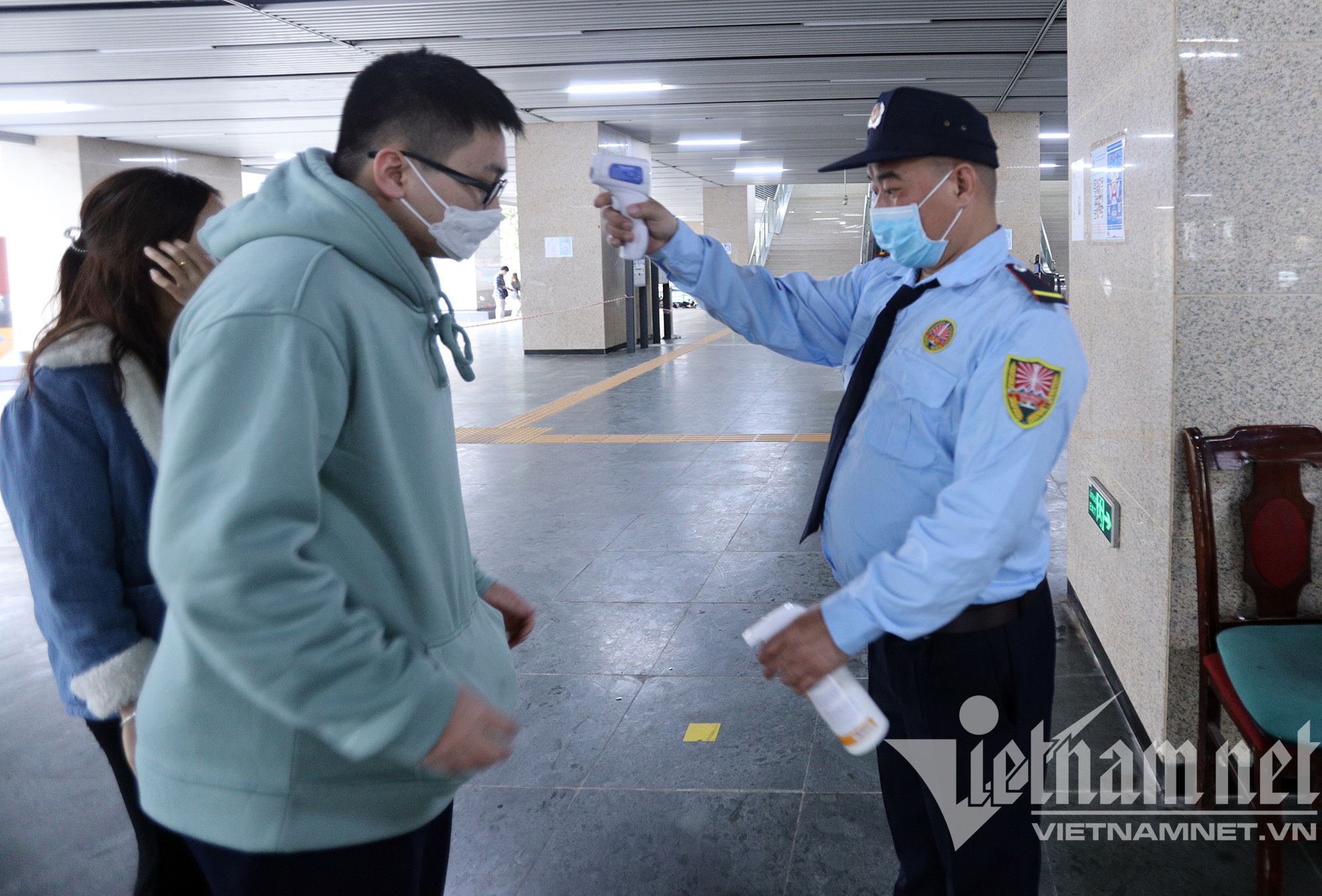 Nhân viên nhà ga đo thân nhiệt, yêu cầu hành khách quét mã khai báo sức khoẻ tại ga Cát Linh