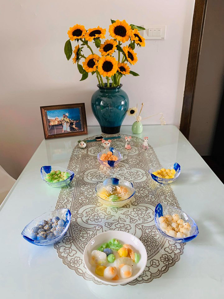 | Bàn bánh trôi, bánh chay tuyệt đẹp do chị Nguyễn Thuỳ Linh (Hà Nội) cùng các thành viên trong gia đình làm và trang trí. |