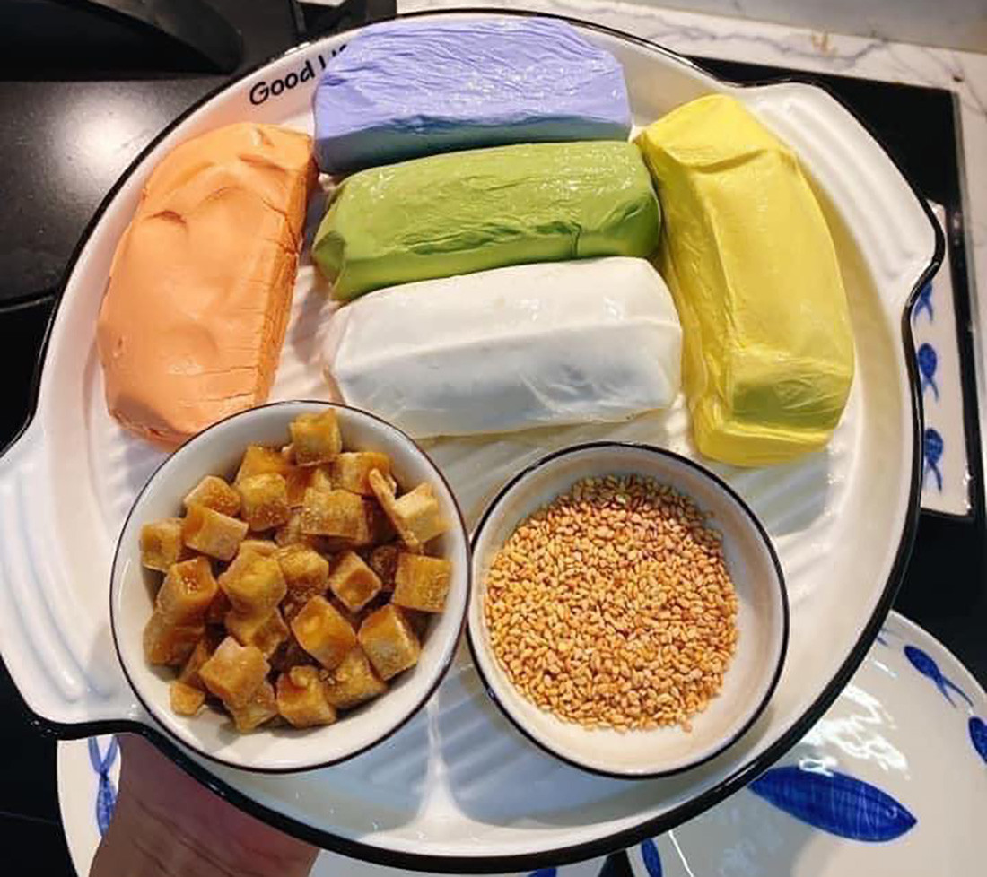 Chị bán bột bánh trôi ngũ sắc với giá 100.000 đồng/set 1kg gồm có 5 màu bột, đường mật, vừng và đậu xanh sên sẵn.