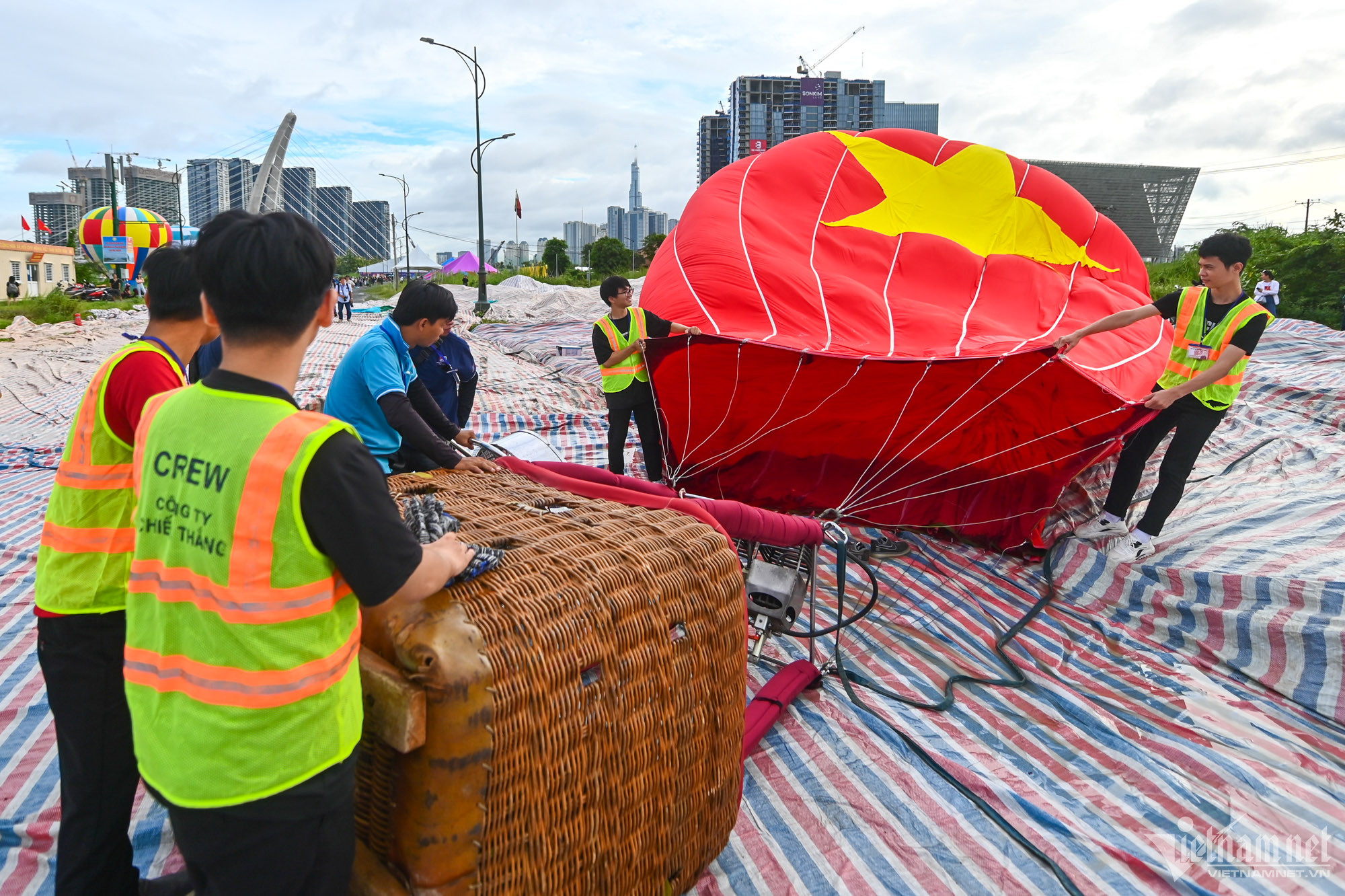 Khinh khí cầu lớn in hình Quốc kỳ cần tới hơn 10 người cùng thao tác mới có thể bay.