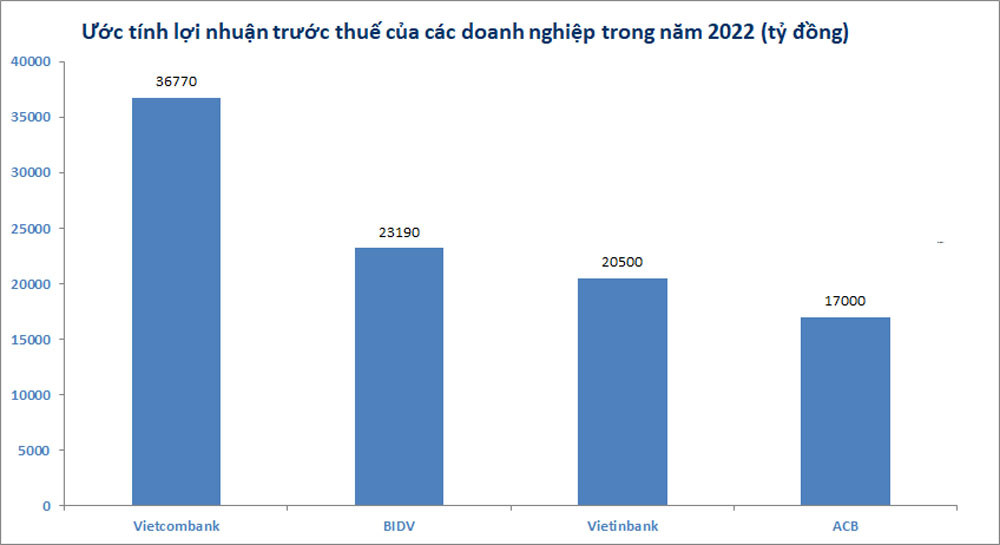 Ngân hàng Vietcombank (VCB) ước tính lợi nhuận trước thuế riêng lẻ trong năm 2022 đạt hơn 36.770 tỷ đồng, tăng gần 39% so với năm trước. Theo Chứng khoán SSI, lợi nhuận trước thuế trong quý IV/2022 của Vietcombank sẽ đạt hơn 12.000 tỷ đồng, tăng 56% so cùng kỳ.