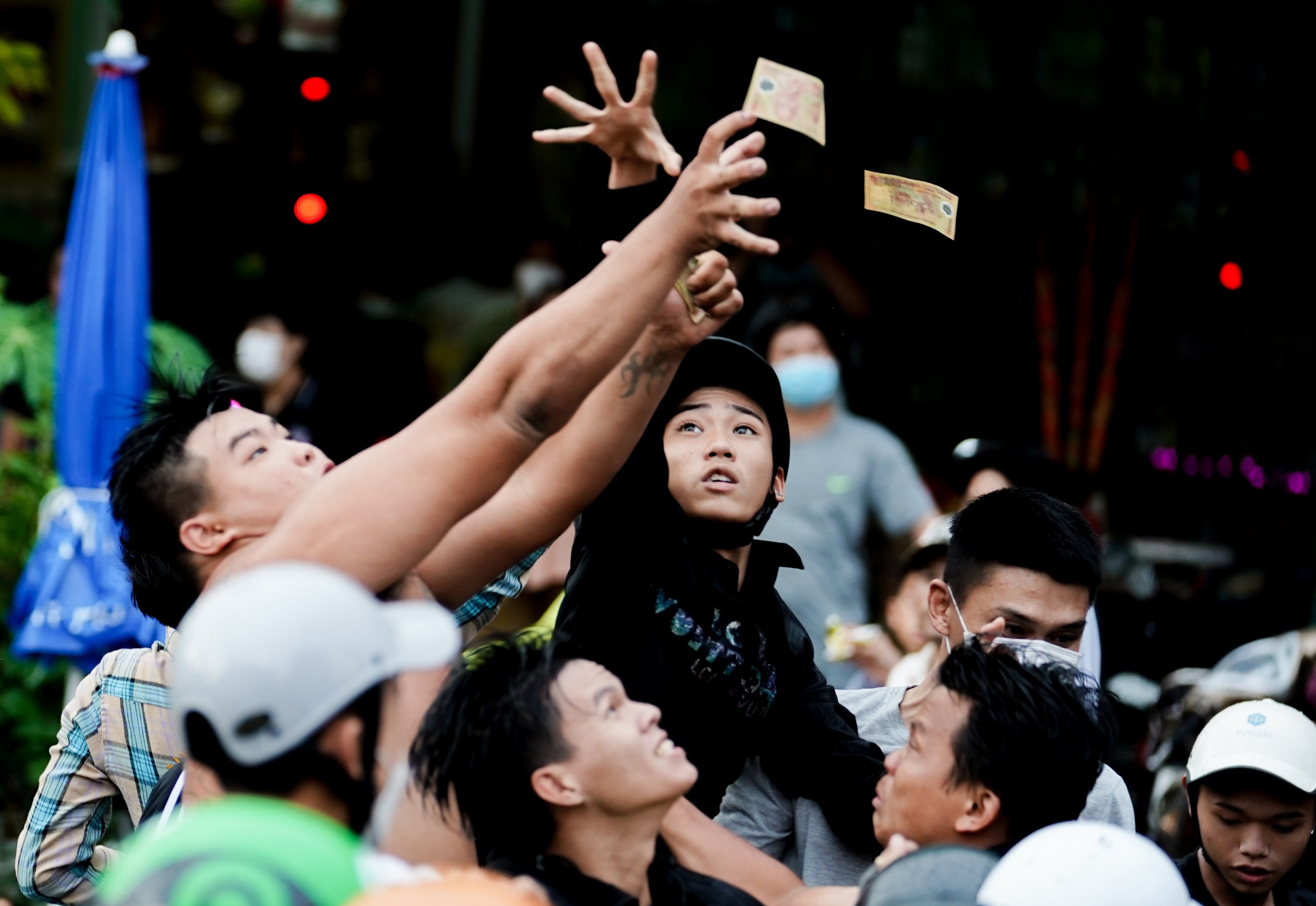 Sau ít phút xếp hàng ngay ngắn để chủ nhà phát tiền, "đội quân giật cô hồn" vội nhao nhao tranh cướp những tờ lộc rơi từ trên cao, chiều ngày rằm tháng 7 ở quận 5, TP.HCM.