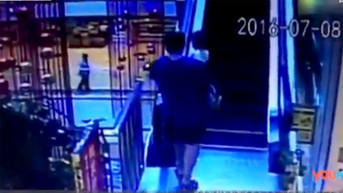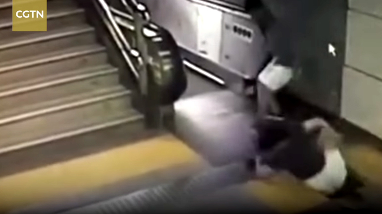 Một người đi bộ đã kịp cứu cụ bà ngã từ thang cuốn tại trung tâm mua sắm ở Nam Ninh, Quảng Tây., Trung Quốc. Quản lý trung tâm và các hành khách đều chạy đến cứu giúp cụ bà, dừng thang cuốn và gọi xe cấp cứu.
