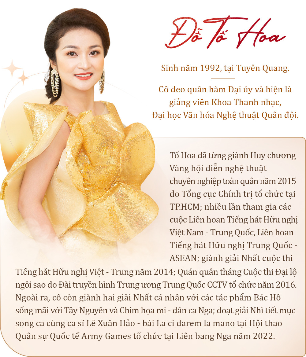 Cùng với danh hiệu Quán quân Sao Mai 2017, những thành tích xuất sắc ngay lần đầu tham gia tranh tài tại Hội thao Quân sự quốc tế 2022 (Army Games 2022) do Bộ Quốc phòng tổ chức tiếp thêm động lực cho Tố Hoa trên con đường chinh phục nghệ thuật đỉnh cao. Môi trường quân đội đã rèn giũa một nghệ sĩ thành “chiến sĩ cầm mic”, giúp cô “cháy” hết mình trên sân khấu xứ sở Bạch dương.