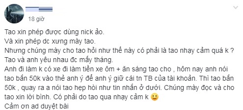 Một bạn nữ đã phải mượn tài khoản để chia sẻ nỗi bức xúc trên mạng xã hội. Có lẽ cô bạn này không muốn lộ thân phận và phần nào đó muốn giữ thể diện cho bạn trai. Theo câu chuyện mà tài khoản T.H chia sẻ, cô có một bạn trai không chỉ ăn bám mà còn không biết điều.