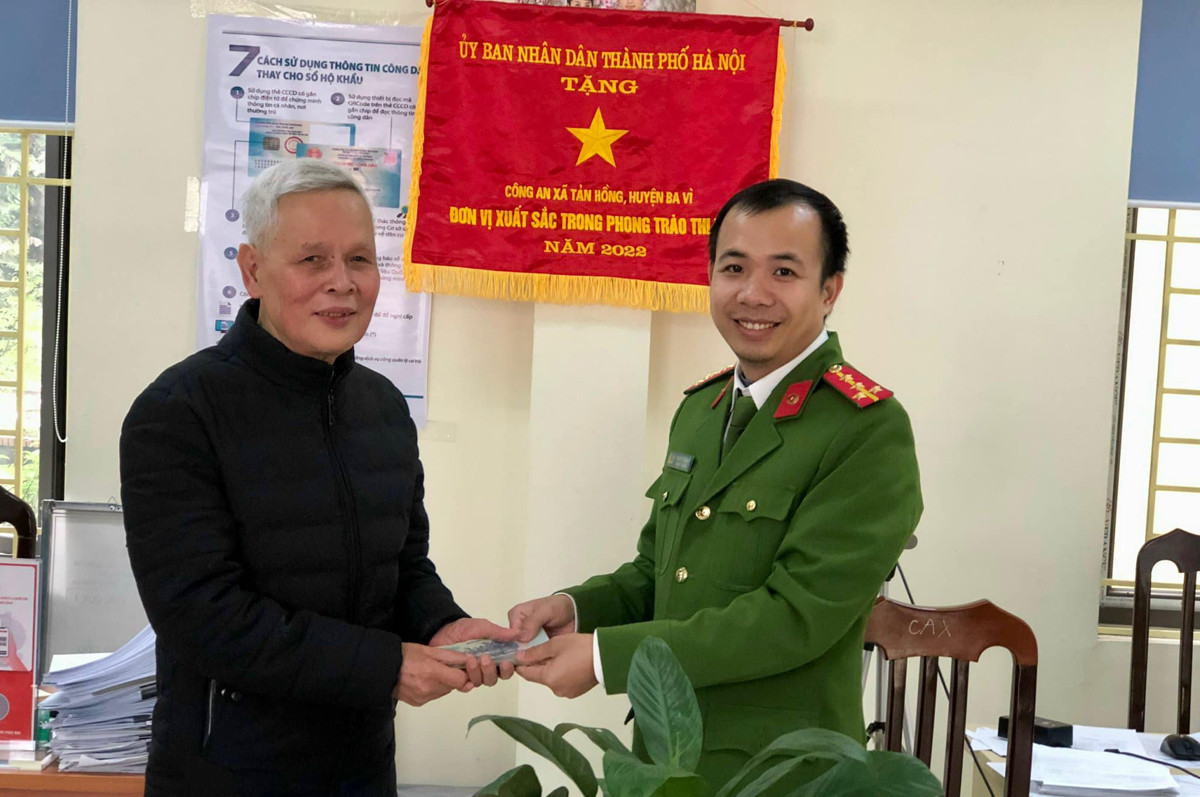 Trước đó, vào khoảng 15h15 ngày 5/1, anh Lê Ngọc Dũng (SN 2000, ở thôn Vân Sa 3, Tản Hồng, huyện Ba Vì, Hà Nội) đến Công an xã Tản Hồng trình báo đã nhặt được 9,8 triệu tại khu vực dốc xuống thôn Vân Sa 1 và nhờ công an giúp tìm người làm rơi để trả lại.