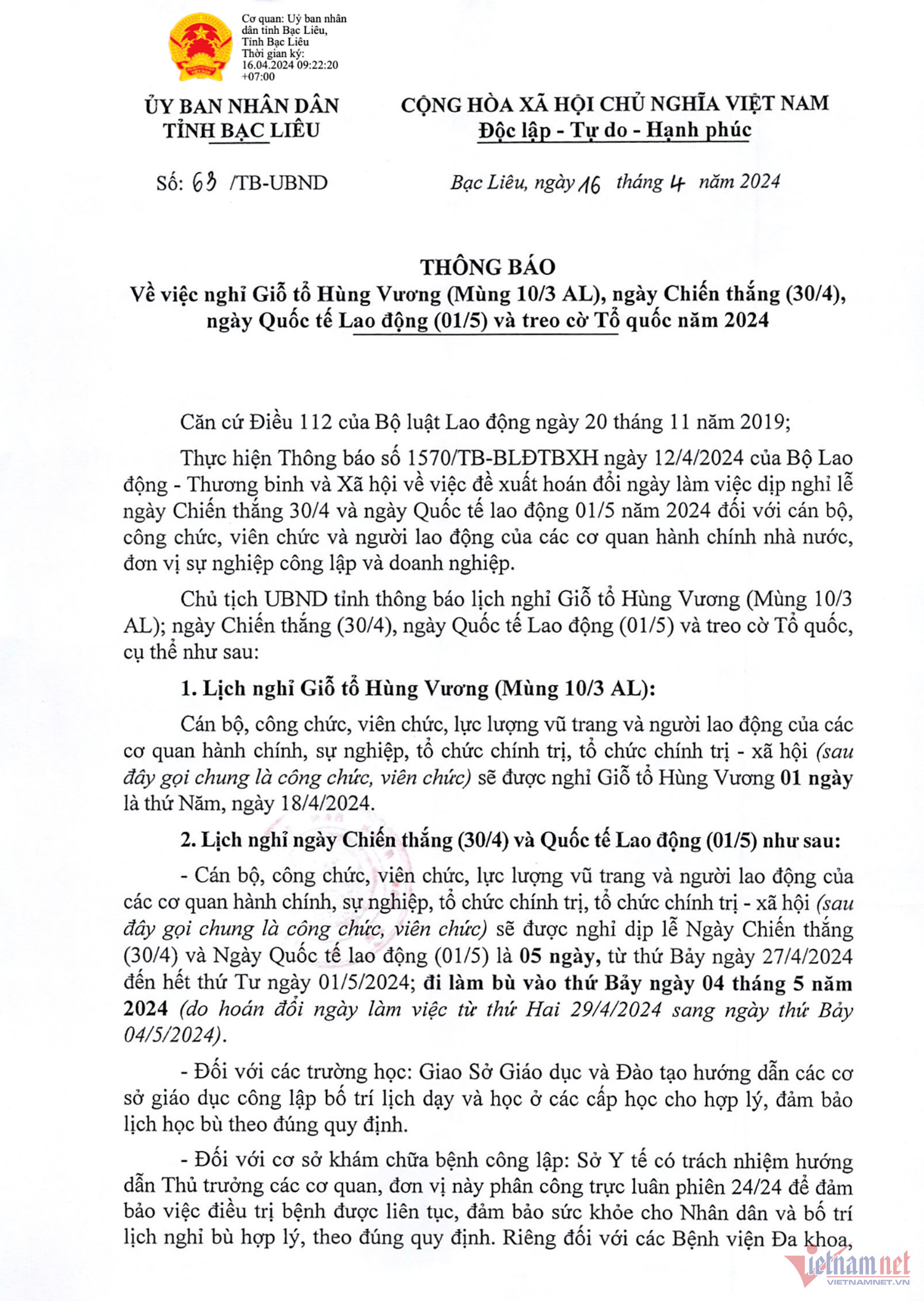 Trước đó, ngày 15/4, UBND TP Bạc Liêu có thông báo số 95/TB-UBND về việc nghỉ Giỗ tổ Hùng Vương (mùng 10/3 âm lịch), ngày 30/4, ngày Quốc tế Lao Động 1/5 và treo cờ Tổ quốc năm 2024.