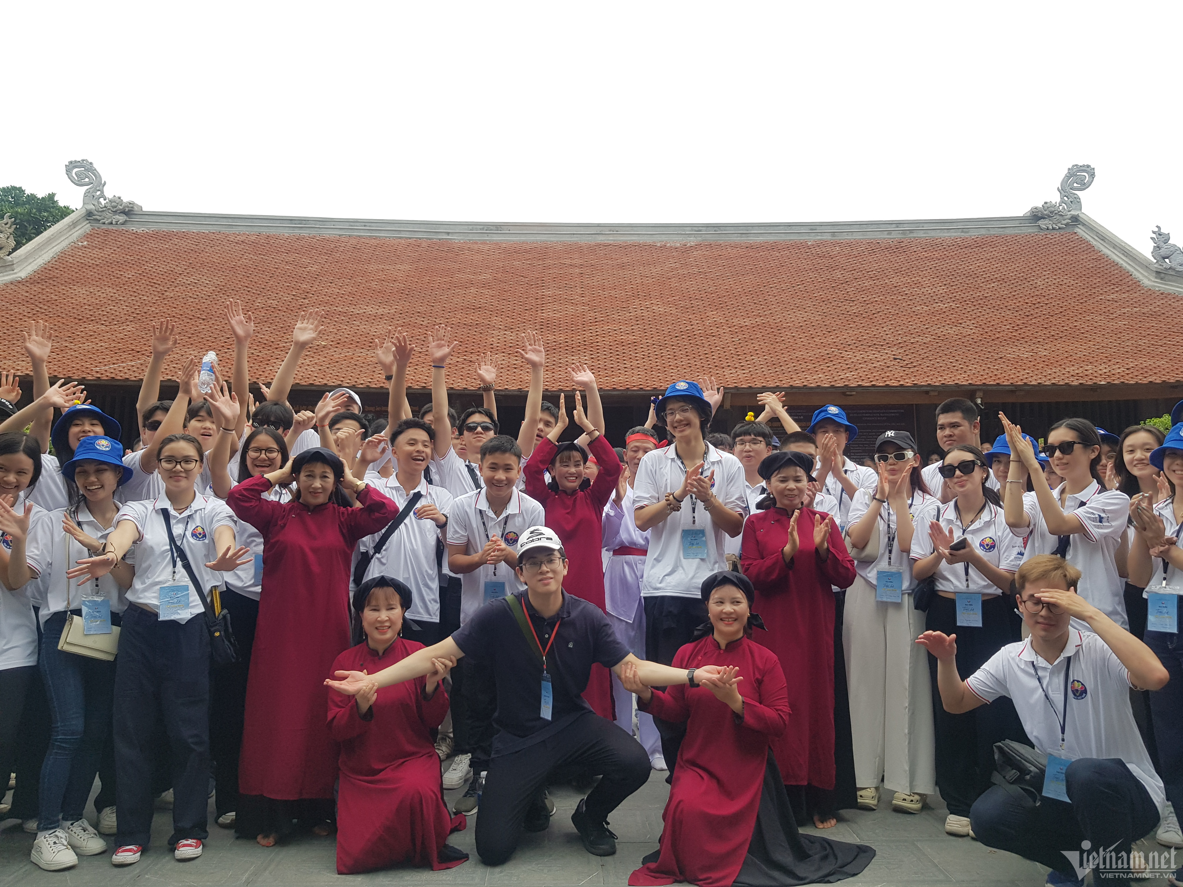 Các bạn trẻ hòa mình với làn điệu hát Xoan của nghệ nhân ở Đình Hùng Lô.