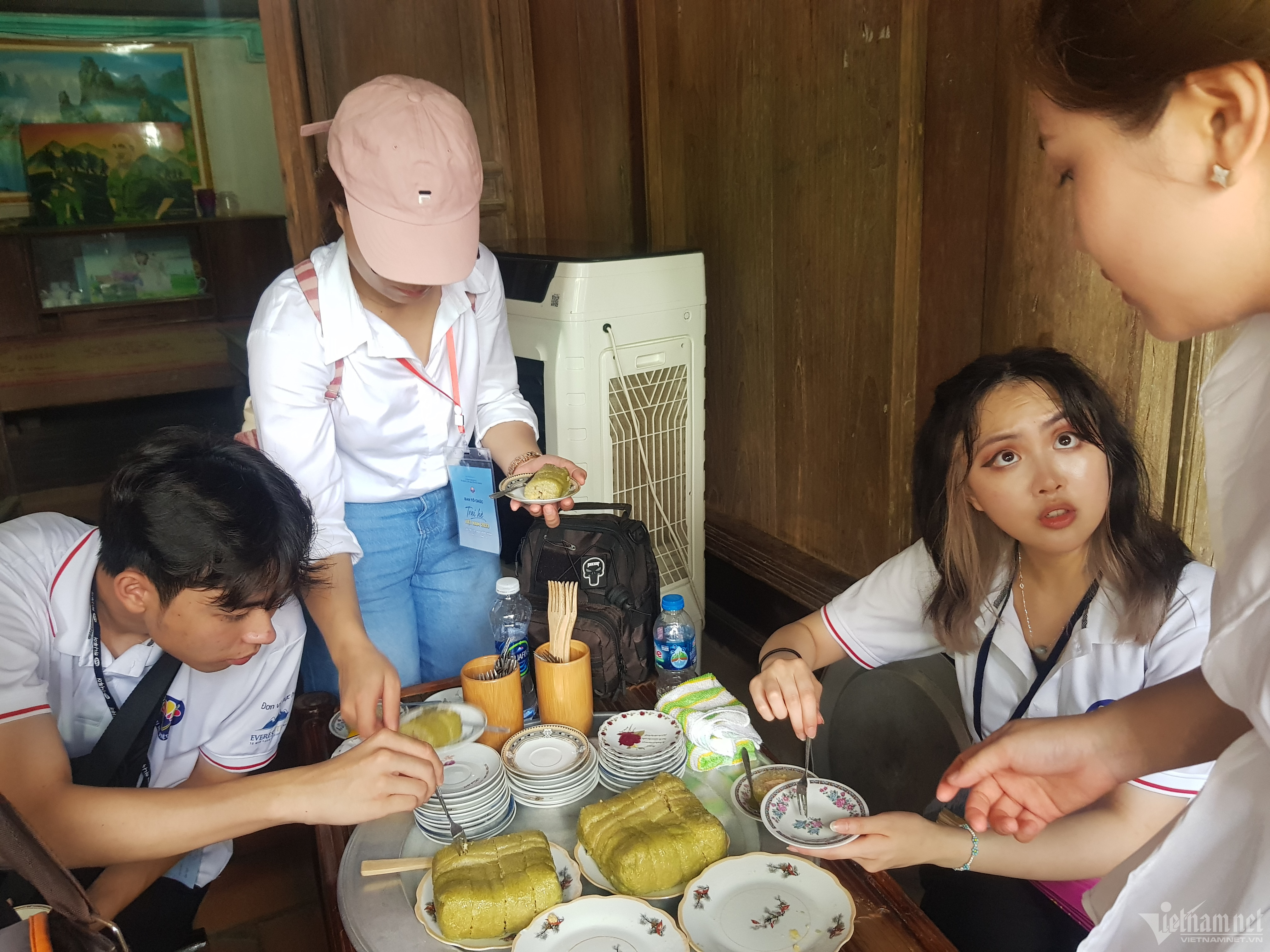Sau khi gói bánh chưng, đoàn đại biểu được thưởng thức bánh do nghệ nhân chuẩn bị.