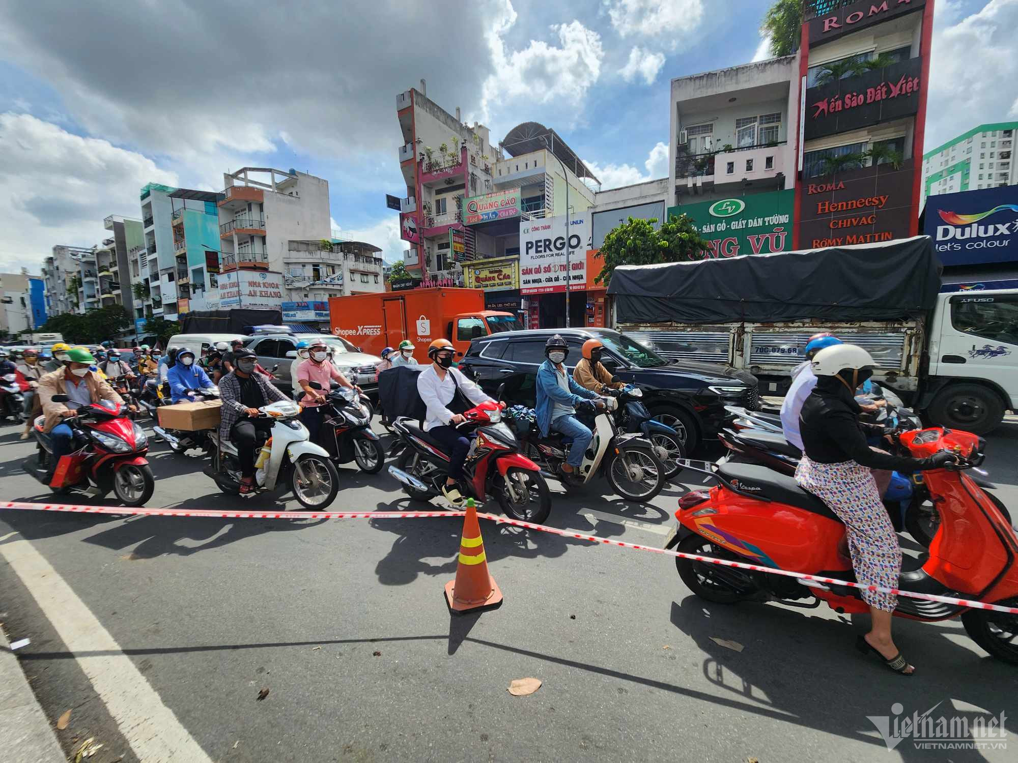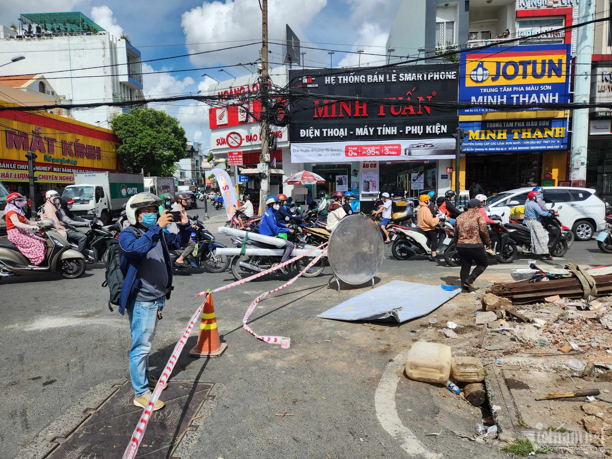 Lực lượng chức năng rào chắn một phần đường để phục vụ công tác tháo dỡ căn nhà có vị trí 'độc nhất vô nhị' ở TP.HCM.