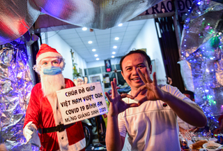 | Năm nay, ông già Noel phải đội mũ chống giọt bắn trong khi đi phát quà để chống dịch Covid. (Ảnh: Nguyễn Sơn). |