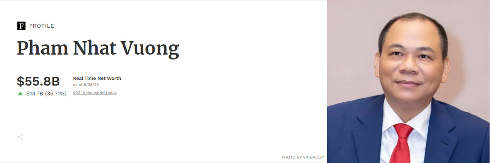 Tính tới hết phiên 25/8 trên sàn Mỹ (rạng sáng 26/8 giờ Việt Nam), theo Forbes, ông Phạm Nhật Vượng có tổng tài sản đạt 55,8 tỷ USD, xếp thứ 23 trên thế giới, thứ 3 châu Á và số 1 Đông Nam Á.