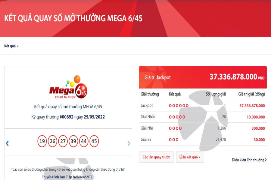 Người trúng thưởng có 60 ngày kể từ ngày công bố giải thưởng để lĩnh thưởng. Quá thời hạn trên, giải sẽ bị hủy và sung vào hạng mục thu nhập khác của Vietlott.