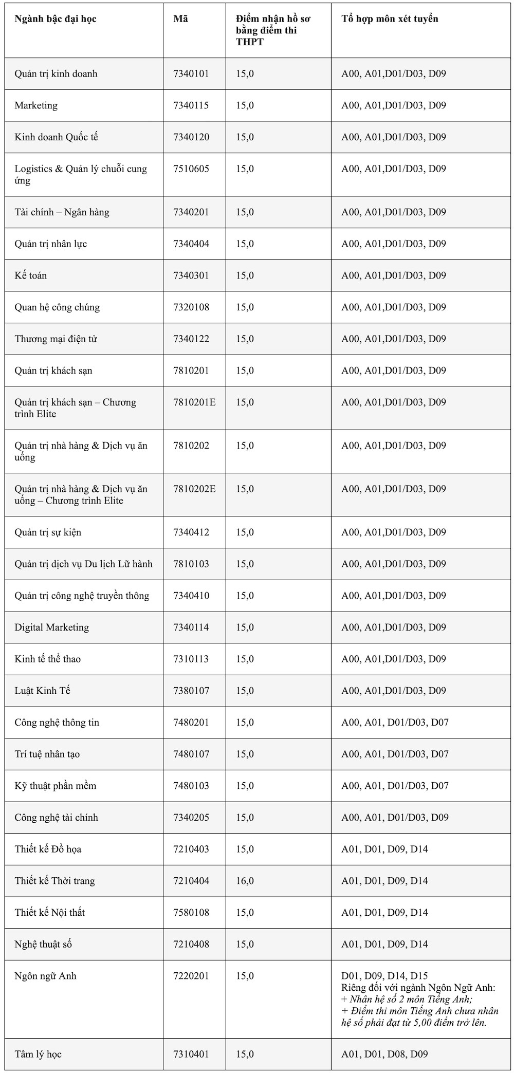 Các ngành Quản trị kinh doanh, Kinh doanh thương mại, Marketing, Luật kinh tế, Luật, Quản trị nhân lực, Bất động sản, Quan hệ công chúng, Truyền thông đa phương tiện, Tài chính - Ngân hàng, Tài chính quốc tế, Công nghệ thông tin, Khoa học dữ liệu có điểm sàn 17. Các ngành còn lại có điểm sàn 16.